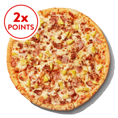 Our Ultimate Hawaiian Pizza starts with our classic marinara sauce and is topped with loads of ham, crispy bacon, juicy pineapple and real mozzarella cheese.